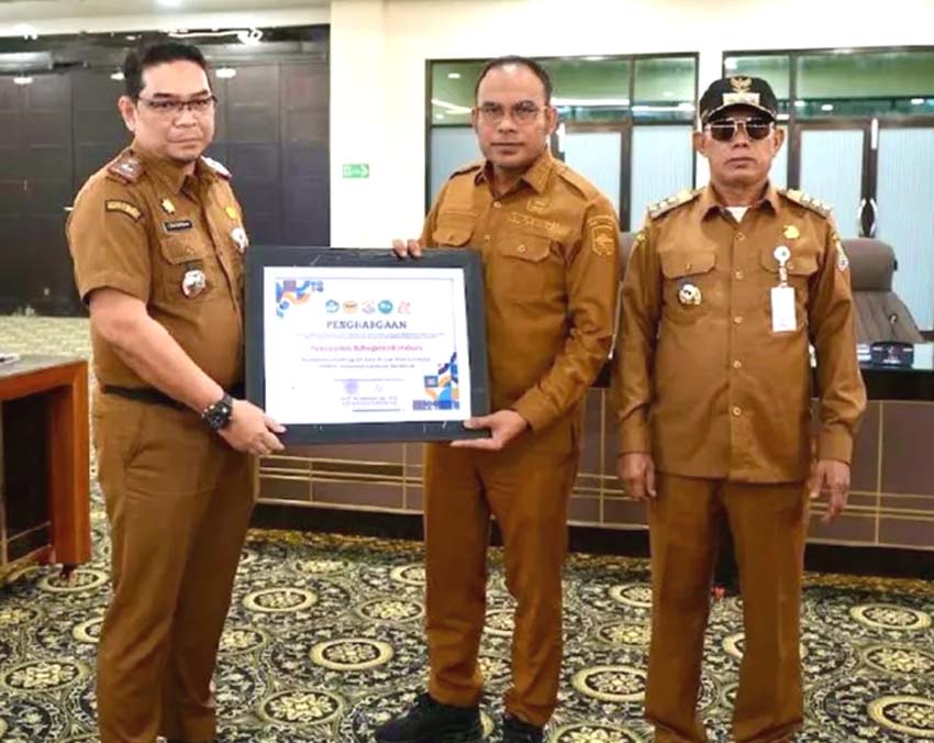 Selanjutnya, piagam penghargaan itu kembali diserahkan Sekretaris Daerah Eka Sapruddin, kepada Bupati Kotabaru Muhammad Rusli dengan didampingi Wakil Bupati Syairi Mukhlis,yang berlangsung di Aula Bamega Setda Kotabaru, Senin (06/10/2025).